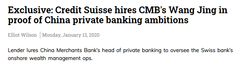 据欧洲货币(Euromoney)1月13日报道,为抢占内地高净值客户业务市场,瑞士信贷(Credit Suisse)已聘请原招商银行(CMB)私人银行业务负责人王菁担任其中国内地私人银行业务(PB)负责人。