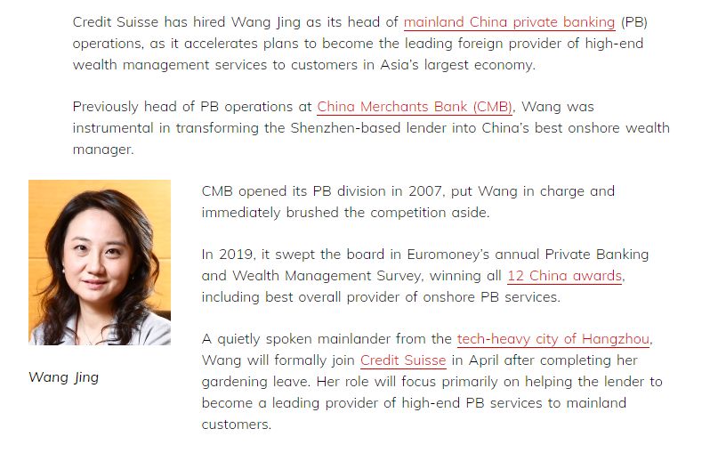 欧洲货币(Euromoney)报道称,随着王菁的加入,其遍布世界各地的高净值和超高净值客户有可能会追随王菁,将资产交由这家世界著名的财富管理机构打理。瑞信在全球有50个办事处,近3800名客户经理。