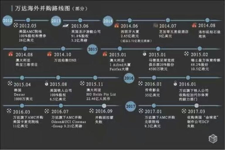以上分别是万达在国内和国外两个市场上的动作(图一)。看起来毫无关联,然而在2017年这两件事却汇总到一件事上来——万达开始大量抛售国内外资产,回笼资金。这既符合“轻资产”发展模式的要求,某种程度上来说也是大量进行海外收购的后果。