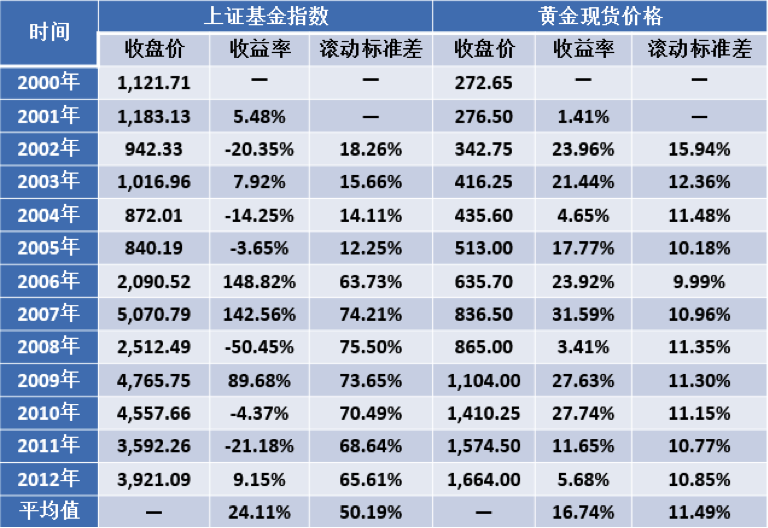 图二 2000年至2012年上证指数和黄金收益率 资料来源:中国社科院国家金融与发展实验