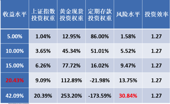 图三 不同投资权重下资产组合的收益率和风险 资料来源:中国社科院国家金融与发展实验室