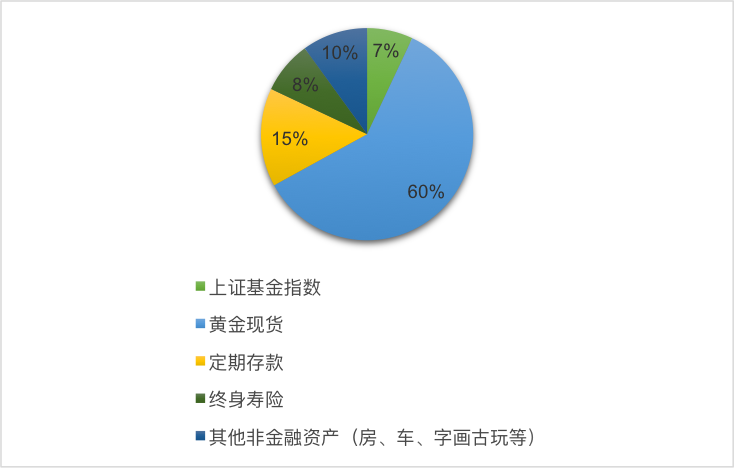 根据2000-2012年上证基金指数和黄金现货风险和收益率的数据(图二、图三),本文建议王健林家族资产配置为,7%投资于上证基金指数的股权信托,60%投资于黄金现货,10%投资于房、车、字画古玩等非金融资产,15%投资于定期存款,8%用于购买终身寿险(图四、图五)。
