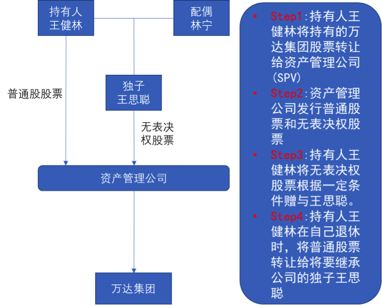 目前王健林已经通过大连合兴投资有限公司将一部分万达的股权转给了王思聪。而未来家业治理和股权重构可以通过下图的方式来实现(图六)。