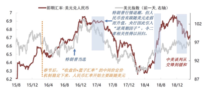 贸易战持续时,笔者的一些做进出口贸易的客户关注很多,因为贸易战关系着客户的生意往来,直至刚刚过去的2019年5月13日晚上,新闻联播中主持人铿锵有力的话语不仅激起了人们的爱国情怀,更引发了后面对于手中人民币的持续关注。图一为来源于Wind资料中关于近年来中美贸易谈判进程影响的人民币汇率与美元指数之间的相关度图表: