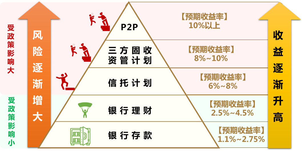 非标的本质是一种信贷资产,信贷资产的收益率和风险永远成正比。基于信贷的理财产品就像是一座金字塔,位于金字塔底的是风险最低收益也最低的银行存款,依次往上分别是“银行理财,信托计划,私募基金(资管计划),还有高风险高收益的P2P产品”。随着潮水褪去,最先爆发危机的也一定是风险最高的P2P产品,之后依次是三方类固收产品,信托计划……正如我们这几年来看到的一样。