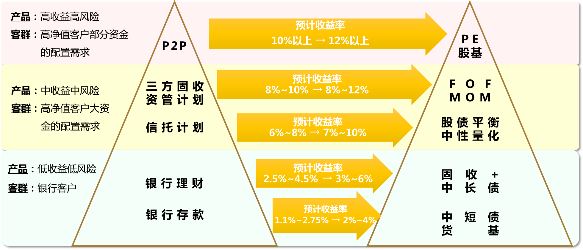 对于过去私人银行、信托公司、三方理财的客户,也就是所谓的高净值客户来说,他们的风险偏好较一般的大众客群高,4%左右的银行理财并不能满足他们的收益需求。这些客户之前还能通过信托计划、资管计划、三方固收产品等来获取8%左右的收益,现在非标资产风险暴露后,产品额度减少,收益逐年下滑,产品风险(信托的不良率1%到3.5%)也有所提升。这样的背景下,高净值客户亟需转向能够提供类似收益水平的产品。