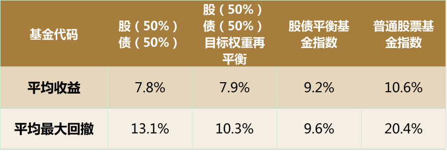 股债平衡基金是股票和债券大致按照“50%:50%”左右比例配置的基金,通过两种相关性较低的底层降低组合风险。维持“50%:50%”的配置基础,不进行择时和再平衡,组合的平均收益约为年化7.8%,最大回撤为13.1%。如果在此基础上做被动再平衡(组合中某类资产权重偏离30%时进行再平衡),回撤将进一步缩小至10.3%。最理想的状态是主动型择时,优化大类资产配置的时间点,组合收益能提升至9.2%,回撤控制到9.6%。而且这种类别产品的优点是容量足够大,不需要频繁调仓。