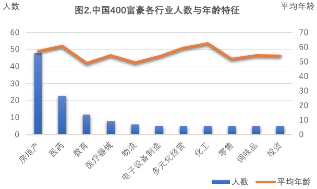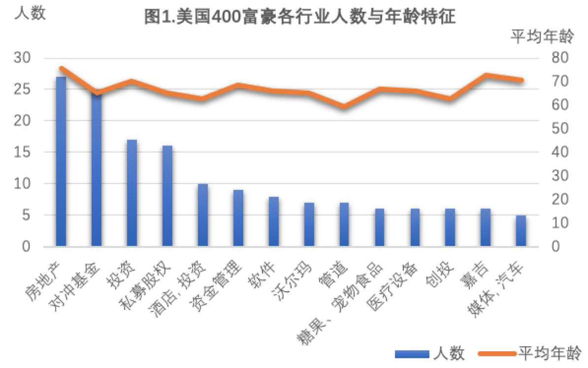 虽然同为创一代,但中美的创一代富豪却并不相同。从年龄上来看,他们处于不同的人生阶段中。采用2019福布斯美国400富豪榜与2019福布斯中国400富豪榜之数据(表1),美国400富豪平均年龄为67.6岁,而中国400富豪平均年龄为56.3岁。50岁以上富豪占美国榜单88%以上,占中国榜单73%;70岁以上富豪占美国榜单44%,占中国榜单仅6%;而80岁以上的富豪仍占美国榜单16%以上,占中国榜单仅1%;更不用提美国榜单上的12位90岁及以上高龄的“老寿星”(如果私人银行经常拿这些数据给客户看看,或许我们的非金融医疗服务就能推广出去了)。从年龄构成上看,美国富豪年龄明显更大,且比重也明显向高年龄方向偏移。对于中国高净值客群来说,在年龄上要形成与美国榜单类似的格局,仍需要不少于十年的时间。(图1、图2)