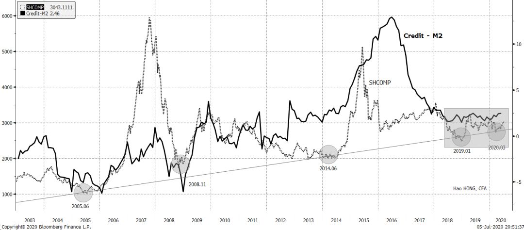 但信贷和货币供应数据描绘的景象与市场共识的看法不同。尽管社融总量和M2都出现了一些加速的增长,并超出了预期,但这两项货币、信贷数据的变化速度自2018年初以来一直保持一致。也就是说,数据并没有显示所谓的“宽信用、紧货币”的局面。从历史上看,信贷和货币供应之间的增长差异一直与上证表现密切相关。2018年初以来,这两个指标增速一直保持均衡,这也是上证一直停滞在交易区间内的关键原因之一(图表2)。