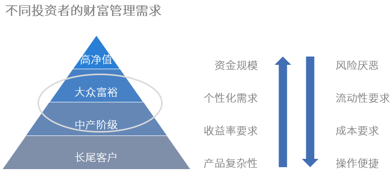 长尾客户的投资诉求主要是安全、便捷、流动性高,很多用户会把钱放在类似余额宝的货币市场基金中;中产阶级投资者对收益率有更高要求,且能承受一定风险,他们主要投资银行理财产品及一些股票基金中;大众富裕投资者有较多的个人财富可以配置,可以尝试更高风险的产品,如私募或信托;高净值投资者主要由银行和财富管理机构的私人银行部来服务。