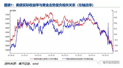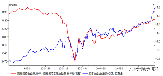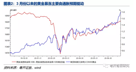 通常来说,黄金是跟着美债实际收益率走的(图表1),受美联储宽松预期和通胀预期两种预期的指引。前者的强弱可以大致从美债名义收益率走势看出来,而后者直接观察经济基本面和通胀的变化即可。