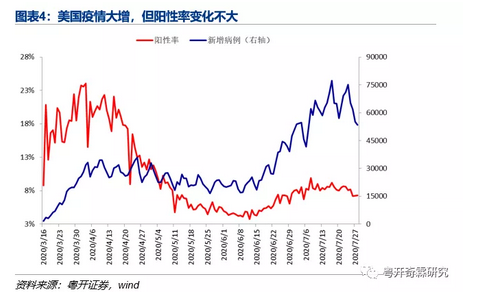 一方面,美国近期疫情的反复,虽然确实有阳性率提升的贡献,但,1)阳性率仅从4%-5%回升至7%-8%%,距离3月份的峰值相差较远;2)新增病例的大幅增长,更多是检测人数大幅增长所致。
