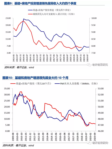从历史数据看,基建+地产投资领先PMI从业人员指数大约10个月,领先城镇居民收入水平大约四个季度,地产+基建越强劲,就业和居民收入水平的恢复就会越快。