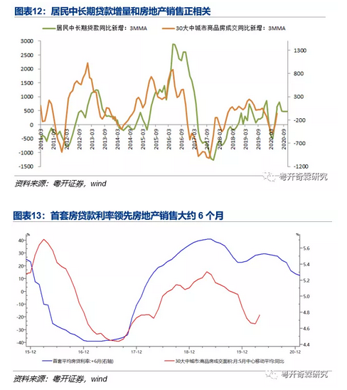 金融条件较好(信用宽松、房贷利率下行)时,房地产销售一般都不错,居民中长期贷款同比新增量、房贷利率和30大中城市的商品房销售都有非常好的相关性,都能有效解释房地产销售的走势。(图表12与图表13)