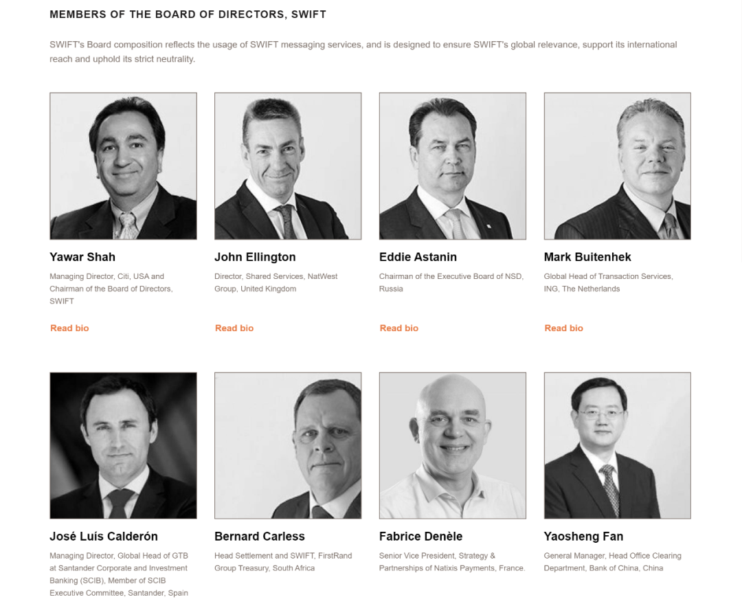 SWIFT有自己的董事会,包括25个席位,美国、英国、法国、德国、瑞士、比利时各2席,中国、俄罗斯、日本等国各1席。如果按大洲划分,是欧洲17席,北美3席,亚洲3席,非洲1席,大洋洲1席。
