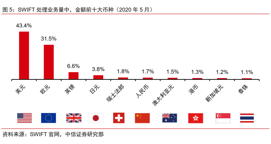 不仅如此,在SWIFT结算货币中,美元、欧元、英镑合计占比超过80%(人民币只占1.7%,港币占1.3%)。