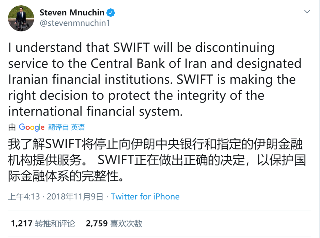 2018年,伊朗好好的没犯事,美国总统特朗普突然决定退出伊朗核协议,重启对伊朗的金融制裁。美国政府再一次要求SWIFT切断与伊朗银行的联系。
