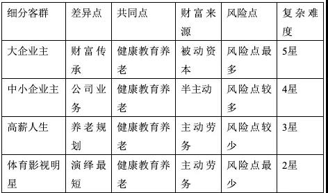 做财富管理的同仁都非常熟悉财务自由是被动收入大于家庭生活支出的财务状态这个概念。就从被动收入的被动程度看,私人银行客户中,那些类型的客户收入更依赖于自身人力资本(主动收入程度)是不同的。下面举例,说明四类客户对自身人力资源依赖度从大到小顺序,体育影视明星,外科名医大律师等专业人士,企业高管高薪人士,企业主。从广义的财务视角上看,上述四类客户是通过对人力资源的消耗换取现金流,既然是人力资源相关维度分析,自然要从其事业生命周期曲线观察,体育影视明星事业生命周期最短,一般不到十年,而专业人士次之,再其次是企业高薪人士,他们可以在几十年,明星和高薪者都是依靠自身劳动力的贡献都是百分百的主动收入,而企业高薪族在一个较完备的制度环境下工作,其替代性就比前者高一些,虽然也是主动收入,而企业主虽然也是劳动力支出但相当一部分已经属于被动性收入了,比如当企业有健全的各种制度,当企业主建立了职业经理人制度后,企业主老板离开企业后,企业仍然产生现金流。所以企业主的收入并不能算是百分百的主动收入。而真正的大老板是完全的被动收入。