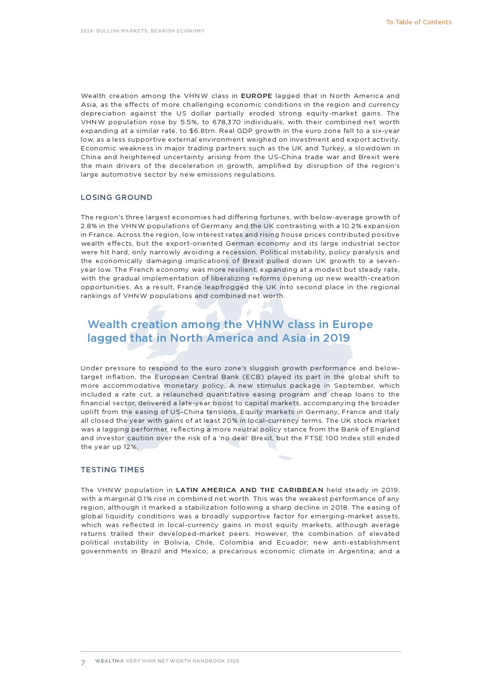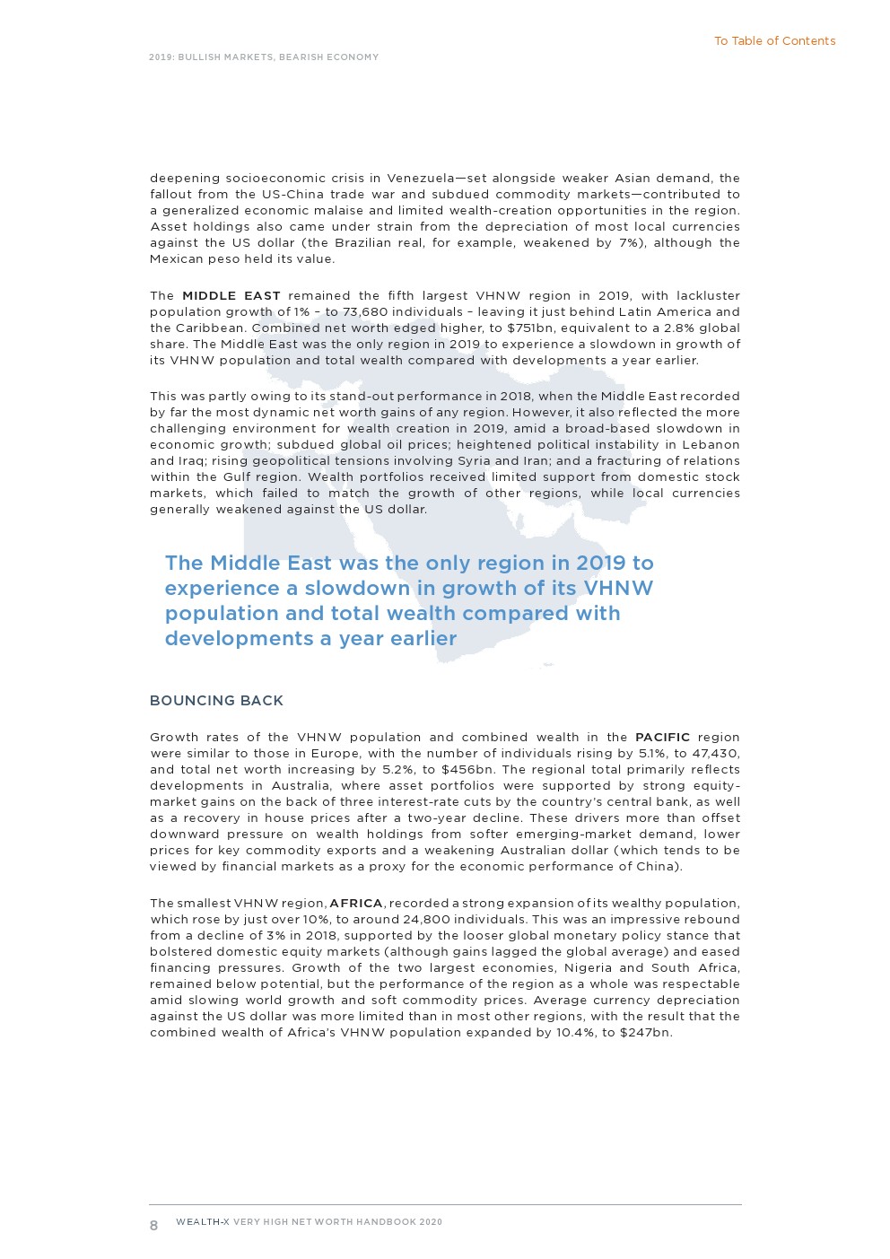 来自 Wealth-X 的2020年财富人群调研显示,去年全球超高净值人群人数及其财富强劲增长。超高净值人群的人数增加了8.5%,达到2825人,他们的总财富增加了10.3%,达到9.4万亿美元,扭转了下滑趋势。尽管全球经济失去动力,地缘政治环境仍动荡不安,但金融市场整体表现看涨。北美和亚洲的超高净值人群数量和总净资产增长最为强劲。这两个地区在两项指标上都实现了两位数的增长。欧洲、太平洋和非洲的超高净值人群财富增长低于平均水平,但仍很健康。相比之下,中东、拉美和加勒比地区的财富创造受到抑制,超高净值人群总数有所下降。