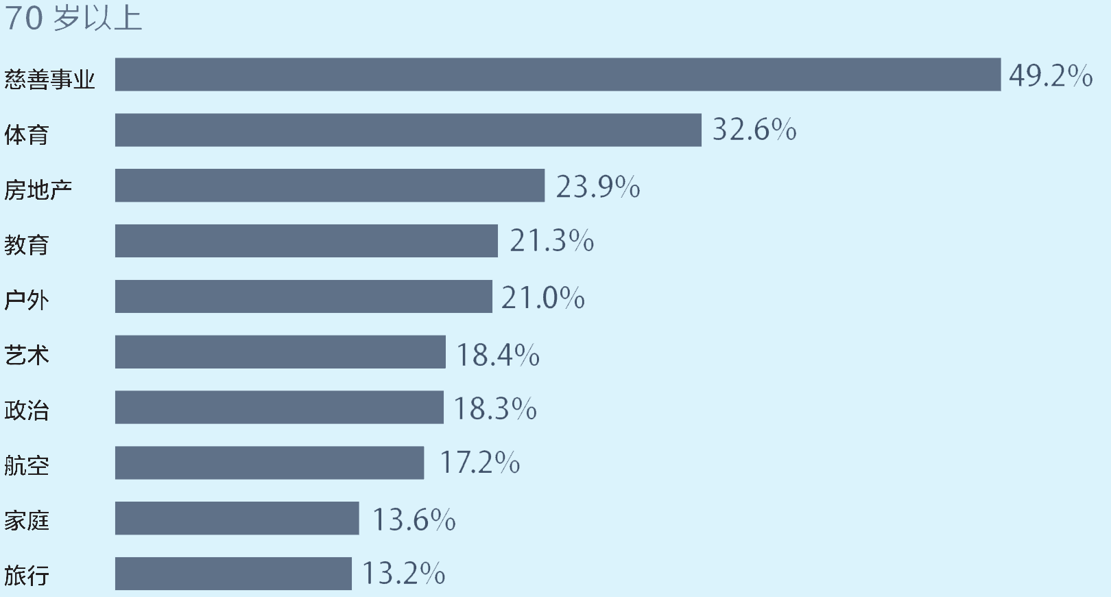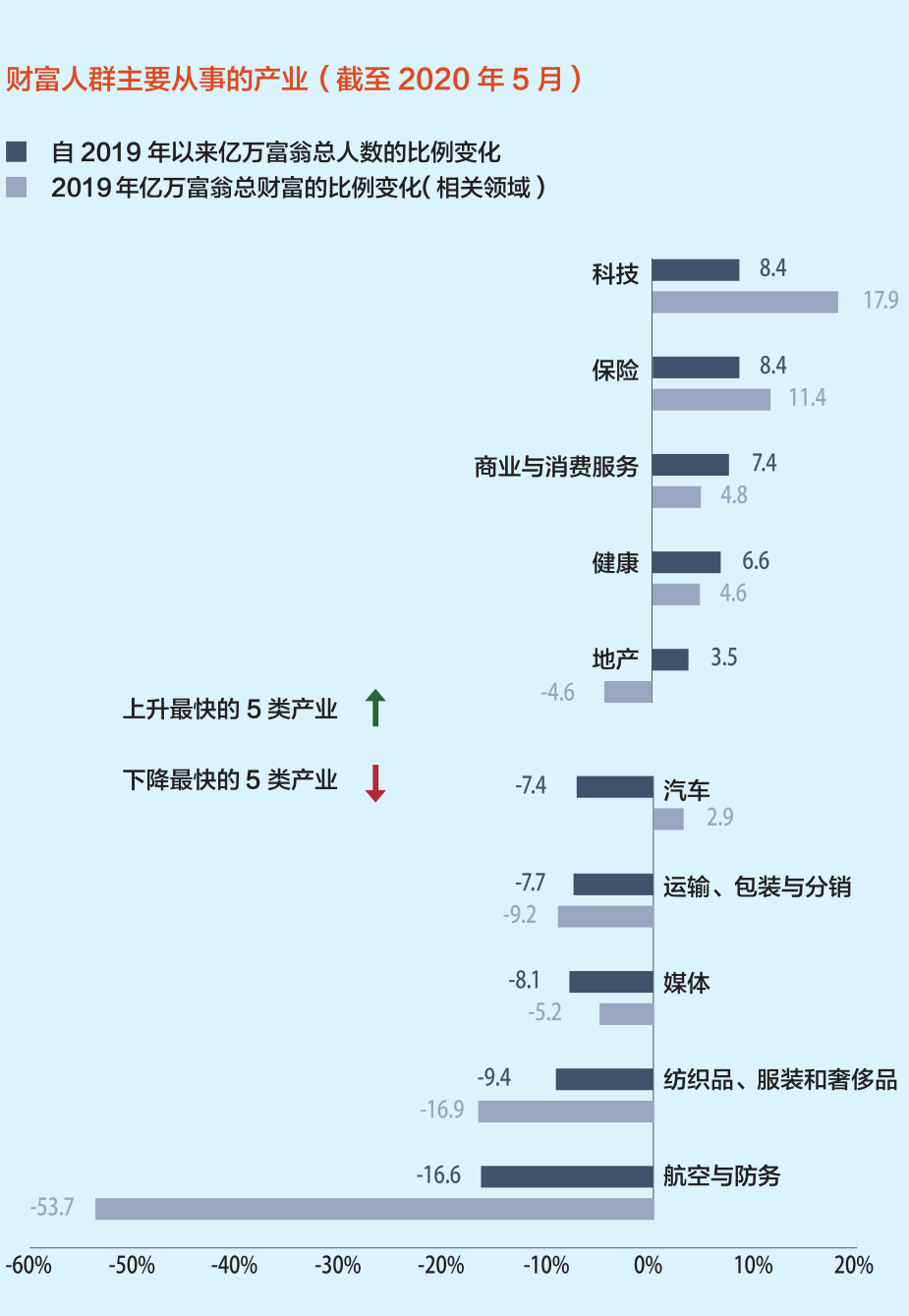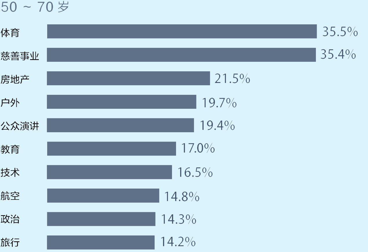 超高净值人群的净资产受疫情影响很大,但并非所有的超高净值人群都受到影响。与2019年相比,2020年前5个月,科技、保险、商业服务和医疗领域的超高净值人群人数增长了6%至 9%。航运业、服装业(包括奢侈品)和航空业的超高净值人群增长明显放缓。在2020年1月至5月期间,超过10%的超高净值人群承诺抗击新冠。其他的捐赠是以非金钱的形式或者是匿名的形式进行。承诺抗击新冠肺炎的超高净值人群与以往的慈善家有所不同。前者往往更年轻、更富有,也更有可能是自己创造财富,以技术为主要产业的人群是其中的积极者。传统的慈善家往往年龄较大,更有可能从事银行业与金融业。慈善事业仍是许多超高净值人群的主要爱好,其次是体育、航空和政治。