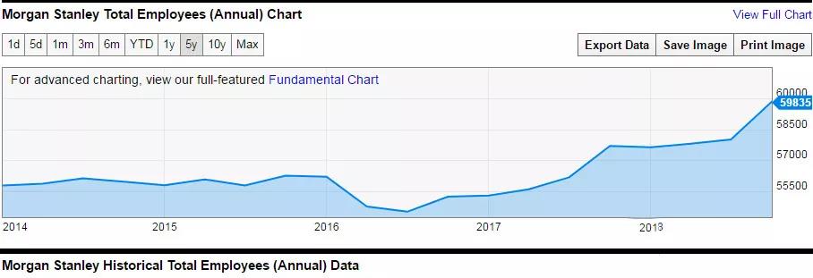 摩根士丹利全球员工约6万名,其中注册投资顾问(Registered Investment Advisor,RIA)约16000名,技术人员约6000~7000名,公司人员走势如下图所示: