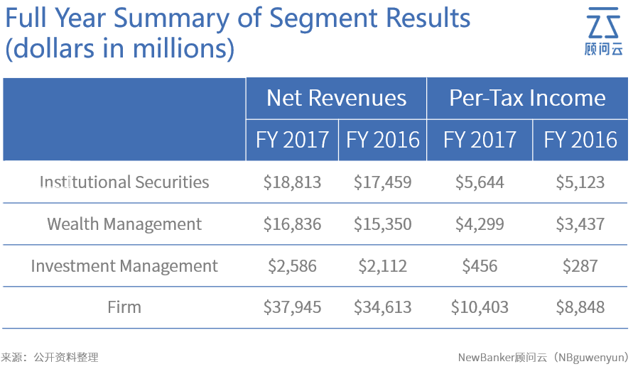 值得强调的是,自2013年以来,摩根士丹利财富管理客户的资产以5.6%的速度增长,远高于市场领军企业美银美林同期3.8%的年增长,与此同时,财富管理利润率从2013年的18.5%提高到了2017年的25.5%。经过近6年的快速发展,财富管理业务已经成为公司最重要的三大业务之一,也被誉为公司皇冠上的明珠。为进行财富管理转型,公司抓住了金融科技这一利器。