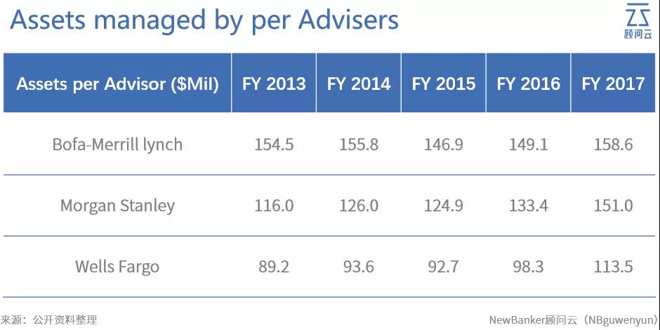 摩根士丹利财富管理,也即原来的摩根士丹利美邦(Morgan Stanley SmithBarney)由原本属于MorganStanley的全球财富管理业务和花旗集团的SmithBarney 于2009年合并组成,当时摩根士丹利控股51%,花旗控股49%。成立初期,公司拥有近20390位经纪业务人员和近1.7万亿美元客户资产,很好的发挥了花旗高端客户多但缺钱,而摩根士丹利钱多但缺客户的互补作用。2012年,经商花旗,摩根士丹利宣布将“摩根士丹利美邦”更名为“摩根士丹利财富管理”,并逐年收购花旗持有股份;2013年,摩根士丹利彻底完成花旗股份的收购。公司注册投资顾问历年人数变化、人均投资顾问管理的资产如下图所示: