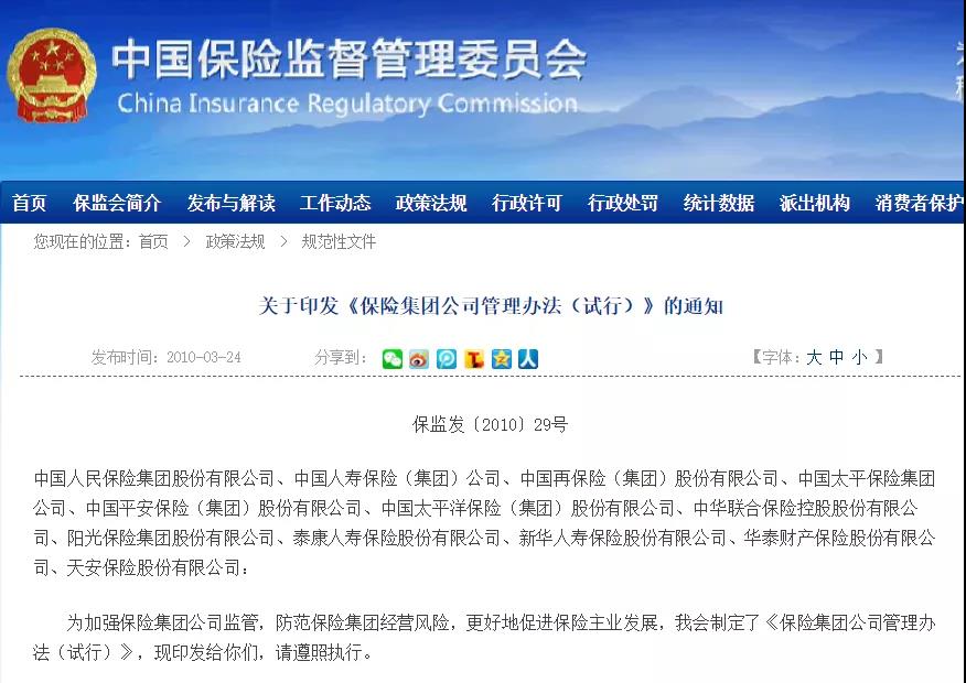2010年印发的《保险集团管理办法(试行)》明确定义了保险集团: