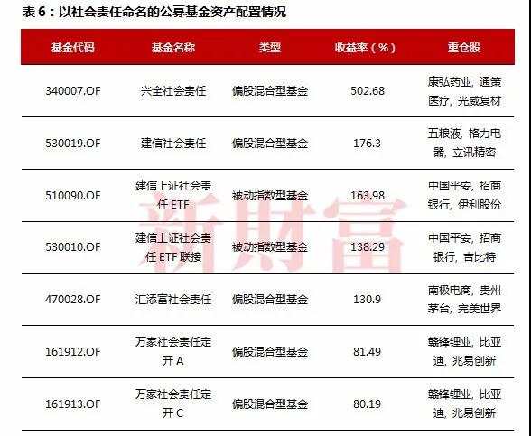 以“社会责任”命名的公募基金有7只,总资产规模达95.3亿元。其中,兴全社会责任基金成立已超过12年,产品规模达61.31亿元,成立至今的收益率达502.68%,获得过金牛奖、金基奖和明星基金等奖项。其在投资目标中强调,重视上市公司在持续发展、法律、道德责任等方面的履行。