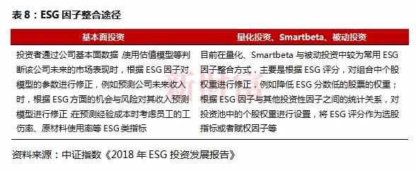 ESG整合策略,则是将ESG投资与基本面投资、量化投资、smart beta投资、被动投资相结合,在分析决策体系中纳入ESG因子,以修正原有模型的参数。这一策略的科学化程度更高,对投研体系的要求也更高(表8)。