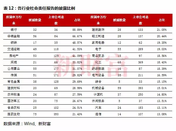 钢铁行业也有近一半的上市公司披露了社会责任报告,交通运输、房地产业公司的披露比例也较高,分别为41.5%和41.9%;汽车、通信行业的公司披露比例最低,均约为13%(表12)。