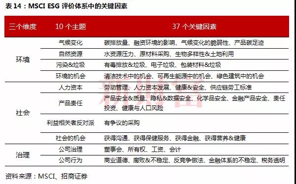 其对公司的ESG评估大致分为两步:首先对10个主题下的37个关键因素进行评分,再通过对关键因素进行加权计算得分,并根据行业之间的差异进行调整,最终得到各行业公司的统一评级,分为代表ESG龙头公司的AAA和AA级,代表平均水平的A、BBB、BB级,以及代表相对落后的B和CCC级,共7个等级(表14)。