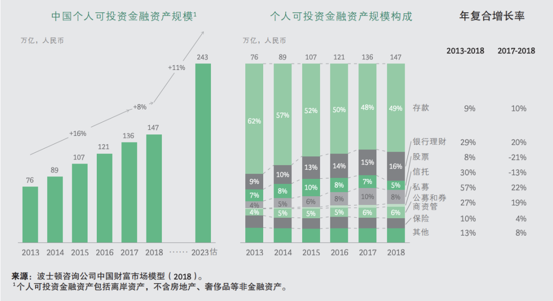 根据《中国私人银行2019》显示,中国个人可投资金融资产规模保持较高的上涨趋势,预计2023年会达到243万亿规模。