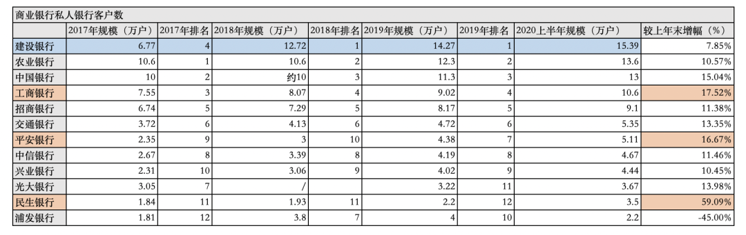 与上述商业银行私行规模的情况恰恰相反,从2017年至2020年上半年的竞争情况来看,客户数的排名变化比较大。