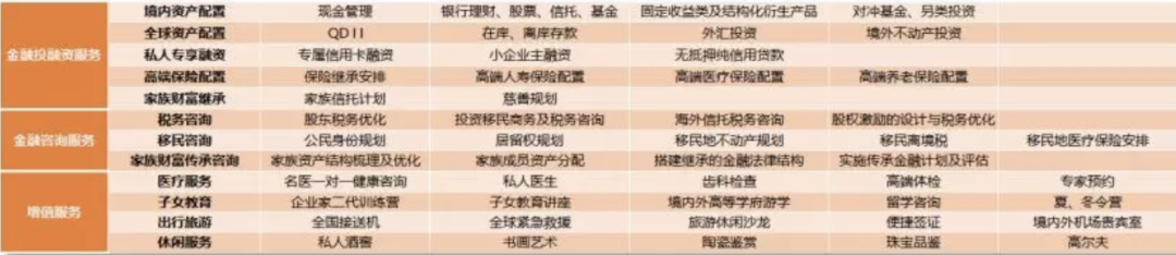目前,商业银行的私人银行业务着重在金融投融资服务、金融咨询服务和增值服务三个方面提升服务能力。金融服务方面,通过构建涵盖证券、基金、保险、信托、期货、金融租赁在内的产品体系,增强资产配置能力,努力提升自主研发产品的能力。同时,加强与同业金融机构的合作,建立安全可靠的第三方产品库,扩大客户的选择范围。在金融咨询服务方面,重点加大专业人才的配置,满足客户关于税务筹划、保险服务、财富传承、移民等方面的咨询服务。此外,多家商业银行尝试通过全球医疗、家庭生活助理、旅行商务助理、国内道路救援、圈层交流等增值服务,使私人银行业务成为高净值客户的贴心管家。