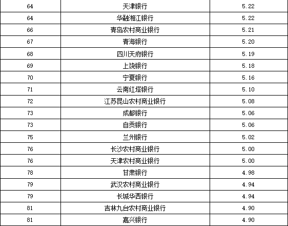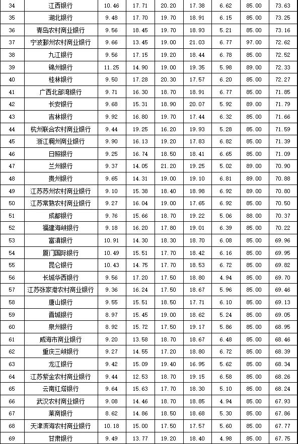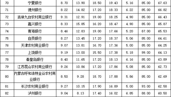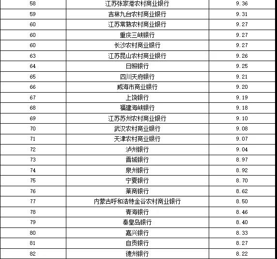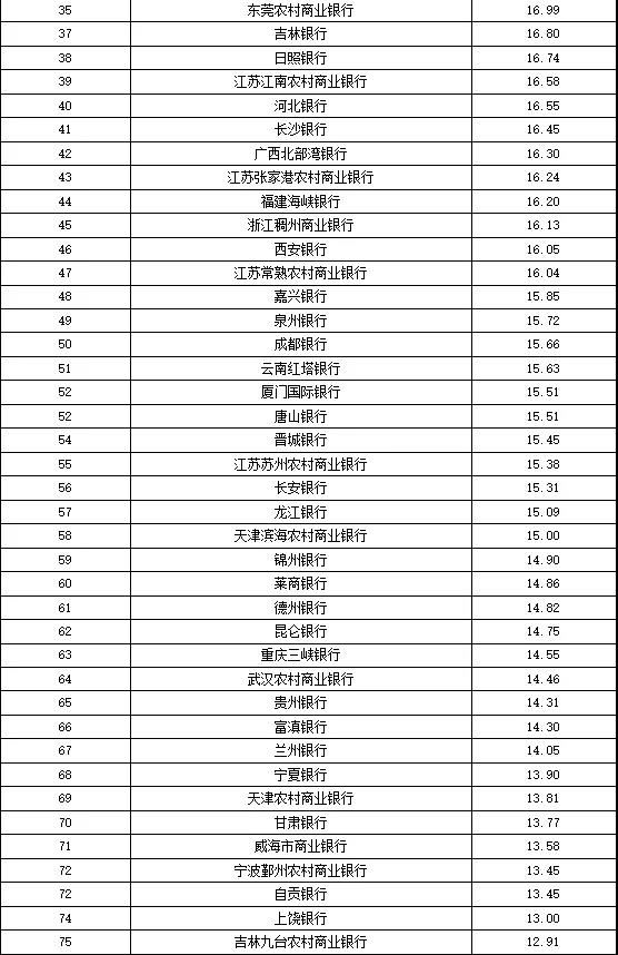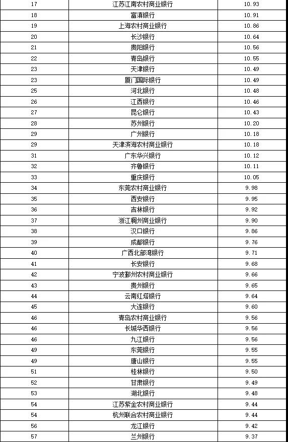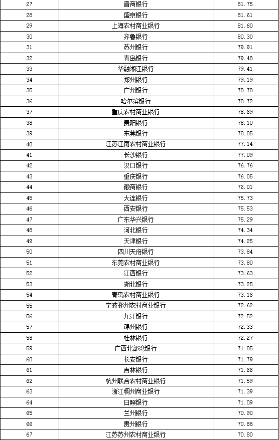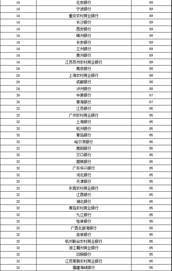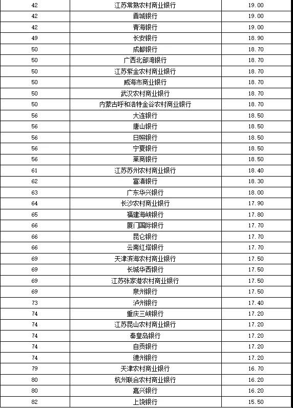 - 区域性银行排名前十五的分别是北京银行、宁波银行(并列第一)、上海银行(并列第一)、江苏银行(并列第一)、杭州银行(并列第一)、中原银行(并列第一)、南京银行、东莞银行(并列第七)、晋商银行、苏州银行(并列第九)、西安银行(并列第九)、广州农商银行、上海农商银行(并列第十二)、青岛银行、长沙银行、齐鲁银行(并列第十五)和兰州银行(并列第十五)。