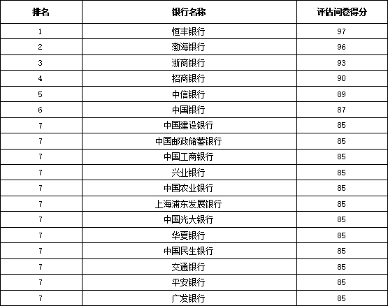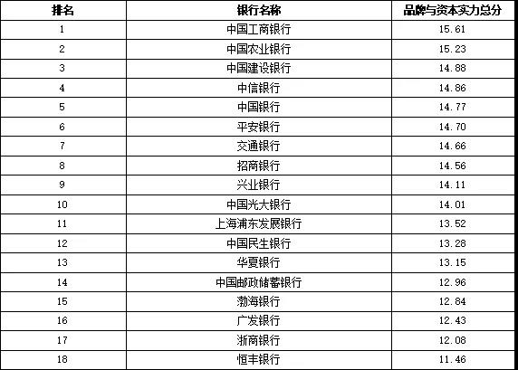 品牌与资本实力:全国性银行排名前五的分别是中国工商银行、中国农业银行、中国建设银行、中信银行和中国银行;区域性银行排名前十五的分别是北京银行、宁波银行、南京银行、华融湘江银行、上海银行、江苏银行、杭州银行、盛京银行、中原银行、晋商银行、郑州银行(并列第十)、哈尔滨银行、锦州银行、重庆农商银行和徽商银行。
