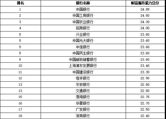 财富服务能力:全国性银行排名前五的分别是中国银行、中国工商银行、中国农业银行、招商银行、兴业银行、中国光大银行(并列第五)、中信银行(并列第五)、中国民生银行(并列第五)、中国邮政储蓄银行(并列第五);区域性银行排名前十五的分别是北京银行、宁波银行(并列第一)、上海银行(并列第一)、江苏银行(并列第一)、杭州银行(并列第一)、中原银行(并列第一)、南京银行、东莞银行(并列第七)、晋商银行、苏州银行(并列第九)、西安银行(并列第九)、广州农商银行、上海农商银行(并列第十二)、青岛银行、长沙银行、齐鲁银行(并列第十五)和兰州银行(并列第十五)。