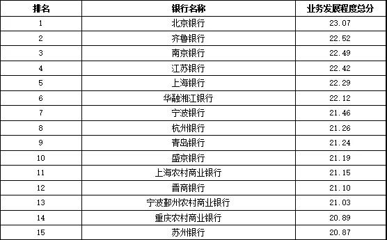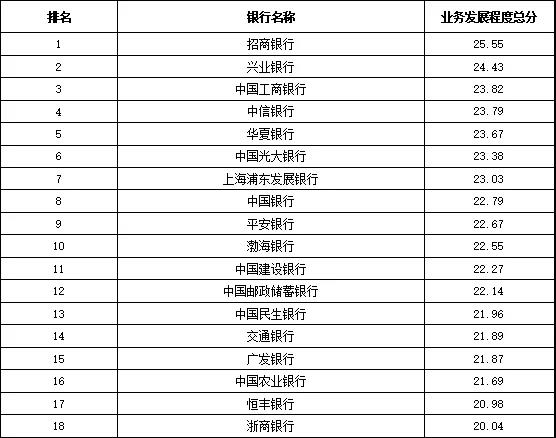 业务发展程度:全国性银行排名前五的分别是招商银行、兴业银行、中国工商银行、中信银行和华夏银行;区域性银行排名前十五的分别是北京银行、齐鲁银行、南京银行、江苏银行、上海银行、华融湘江银行、宁波银行、杭州银行、青岛银行、盛京银行、上海农商银行、晋商银行、宁波鄞州农商银行、重庆农商银行和苏州银行。