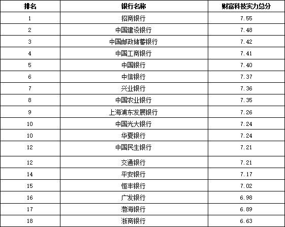 财富科技实力:全国性银行排名前五的分别是招商银行、中国建设银行、中国邮政储蓄银行、中国工商银行和中国银行;区域性银行排名前十五的分别是江苏银行、南京银行、苏州银行、宁波银行、北京银行、晋商银行、上海农商银行、中原银行、上海银行、广州银行(并列第九)、贵阳银行(并列第九)、江苏江南农商银行、广州农商银行、重庆农商银行、东莞银行和齐鲁银行(并列第十五)。