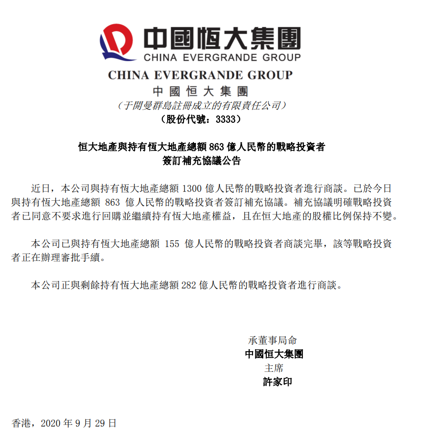 据恒大最新发布的公告,1300亿战略投资资金中有863亿已签署补充协议,同意不要求回购,将转为普通的股份,剩余的投资者也在商谈中。