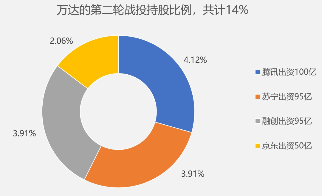 结果万达回A股上市的申请一直也没得到批准。到了2018年1月,眼看上市遥遥无期,万达拉来了朋友帮忙:由腾讯作为主发起方,联合苏宁、京东、融创合计投资约340亿元人民币,接手外部财团持有的约14%万达商业股份。