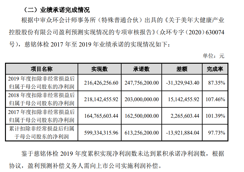 *补偿方案的确定过程可参照美年健康发布的《关于慈铭健康体检管理集团有限公司2019年度业绩承诺实现情况及业绩补偿实施方案的公告》