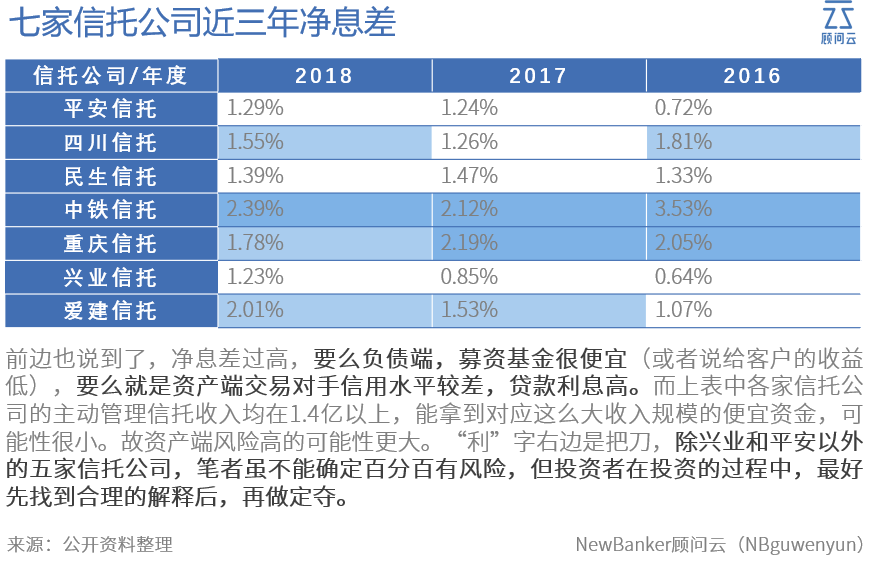 “净息差”参考银行业,本质就是资金一买一卖的价差。正常情况下,净息差平均值不到1%,如果超过这个数,信托买家就该提高警惕。