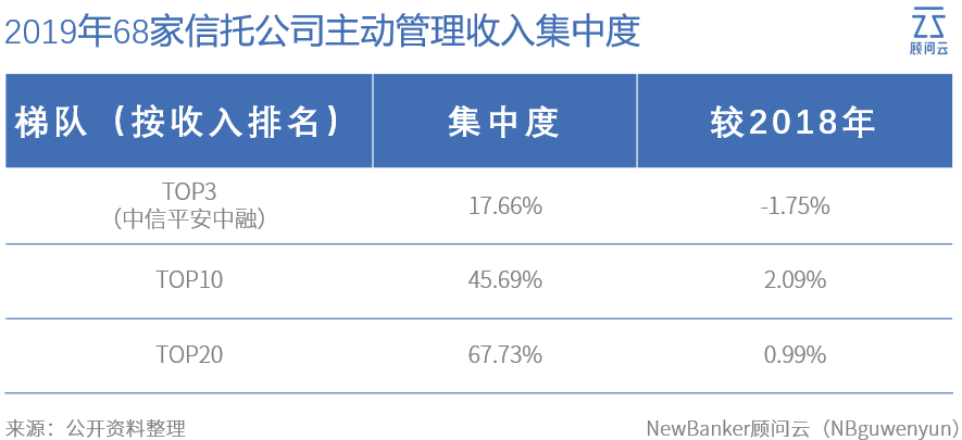 主动管理收入,信托业半壁江山属于前10强信托公司,三分之二的份额被前20强瓜分。
