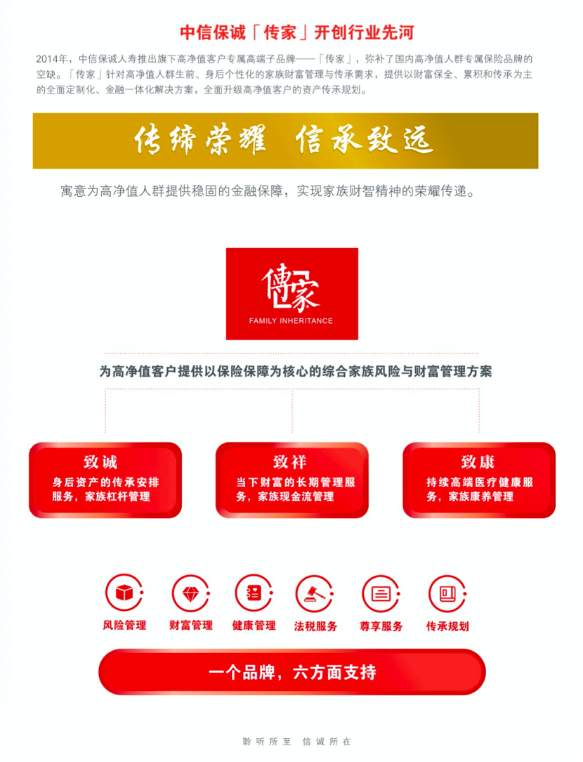财情社:既然通晓高净值群体的需求,中信保诚人寿能为之提供什么服务?尤其这家成立于2000 年的险企,14年后重磅推出面向高净值群体的「传家」品牌,又有何独到之处?