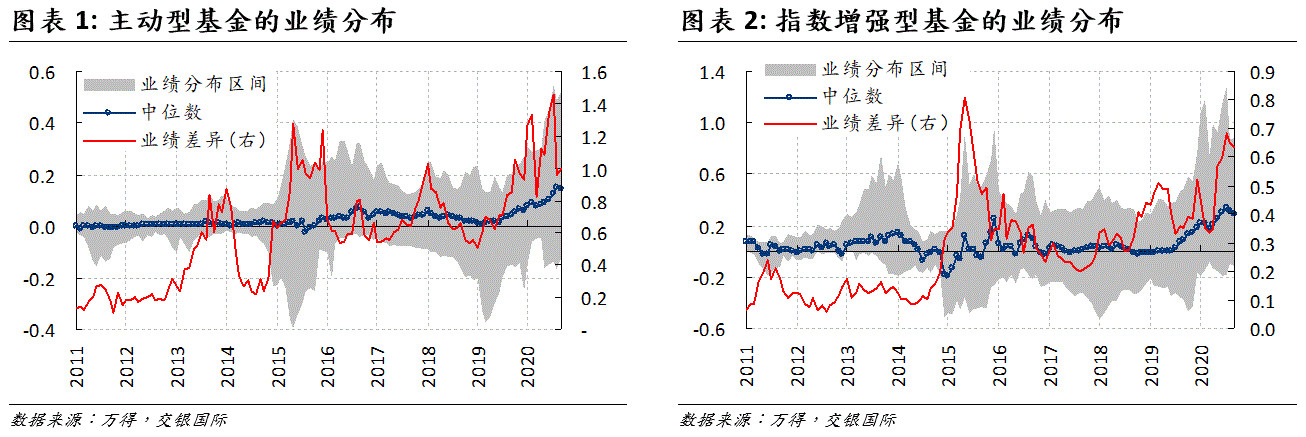 指数增强型基金的业绩持续性比主动型基金更强,并在不同的持仓时间长度内都有效。同时,我们发现,最好和最差的指数增强型基金的回报差异在今年下半年的反弹中已拉开到2015年中泡沫时期的水平。但是,最差的指数增强型基金的回报今年以来也有所提高,虽然与最好的基金的差距在拉大。这种现象的出现,显示今年以来指数增强型基金整体的水平都有所提高。我们认为,指数增强型基金的头部效应来自于它策略自身的复合回报成长效应。好的指数增强型基金初期的构建使它通过良好的回报形成的内生成长,以及因此吸引的新增资金流入形成了规模不断增大的正循环效应。在即将到来的2021年,我们也会选择坚持和最好的指数增强型基金经理在一起。