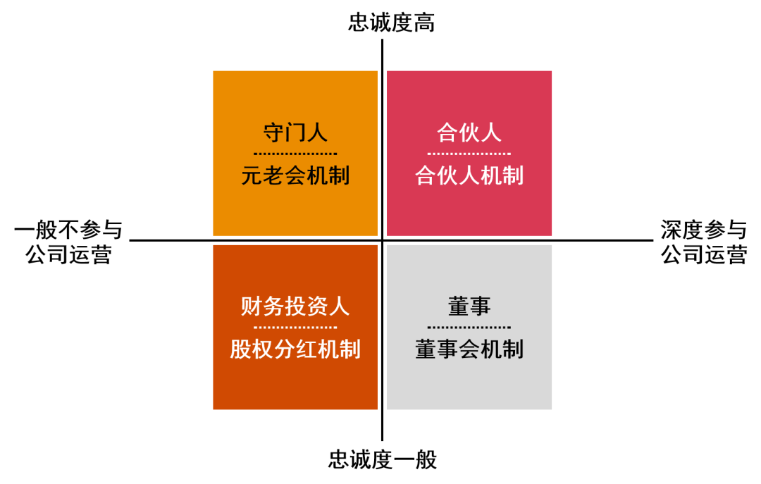 通过对国内外家族企业的观察与研究,普华永道发现,根据家族和接班人对老臣的定位,可以从公司治理机制入手,通过公司内部组织的调整帮助家族与老臣建立新的关系。根据忠诚度以及未来参与公司运营的程度,可以将老臣分为守门人、合伙人、董事以及财务投资人四个角色,下面分别阐述这四个角色以及相对应的四种机制。