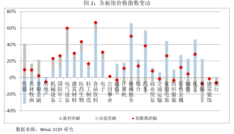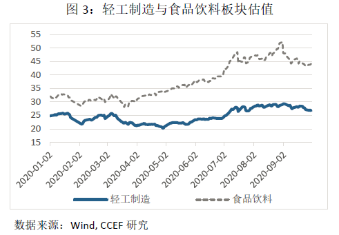 通过对2020年初至今28个行业价格指数变动率及其影响因素的分析,我们发现:传媒、农林牧渔、房地产和非银金融板块在盈利增长的时候,估值下行。其中传媒板块年初至7月中下旬价格指数上涨主要来自于估值变化的贡献38%,8月以后行业业绩有所改善,市盈率相应下降估值逐步回归。房地产板块受持续收紧的楼市调控政策和监管新规影响,行业发展有较强的不确定性,市场对其未来的预期不乐观,因此估值一路走低。农林牧渔板块今年一至三季度持续盈利,上半年板块内上市公司净利润同比大幅增长217%,但股价没有反应出这些盈利增长。由于农林牧渔相关产品需求长期稳定,业绩确定性较强,当前接近历史最低位的估值存在较大的上涨空间。