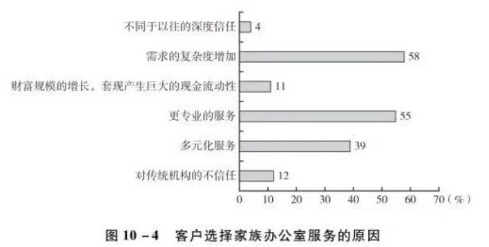 在用户选择家族办公室的具体原因方面,相较于以往传统金融机构所提供的服务,客户选择家族办公室的主要原因在于目前对于多元化服务的需求,且需求的复杂程度不断提升;而这些服务目前可能在传统金融机构的服务框架中较难得到有效满足(图10-4)。